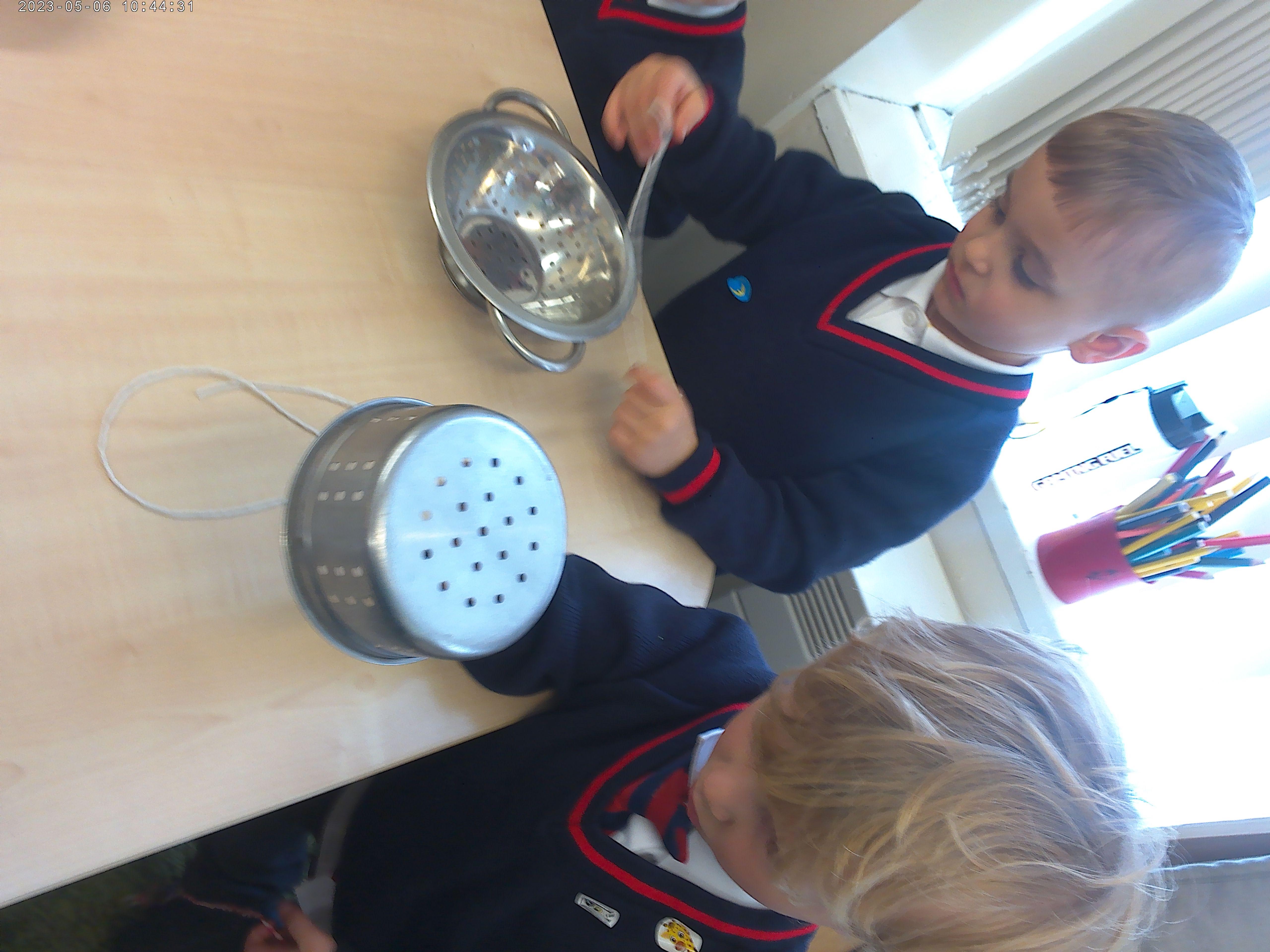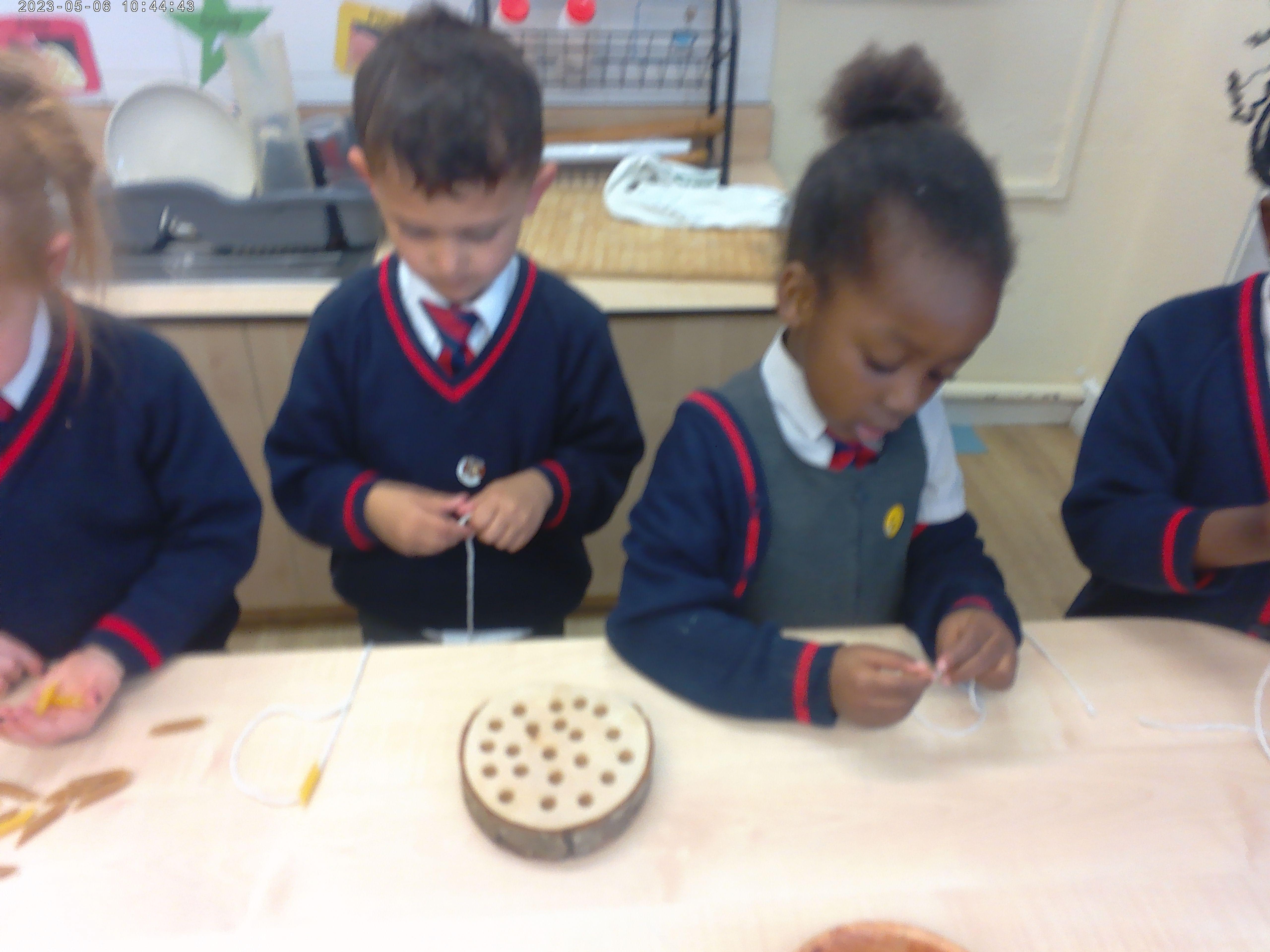 Nursery have been practising their threading skills. We threaded pasta onto string, pipe cleaners through colanders and have been weaving in and out of punched holes.