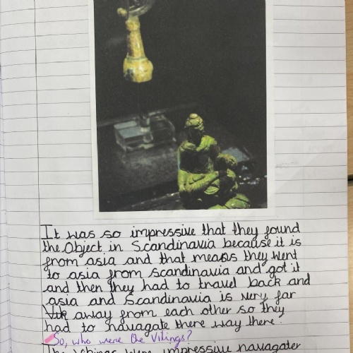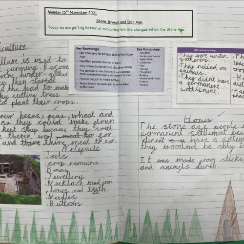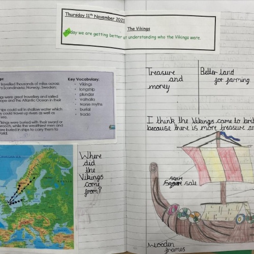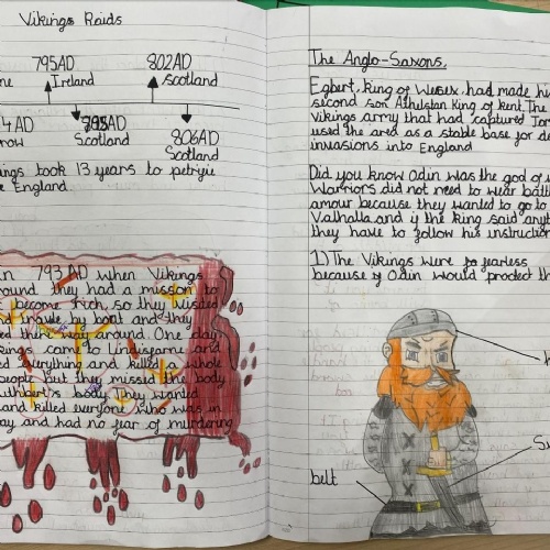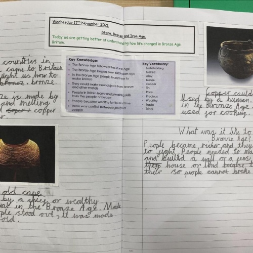 In Key Stage 2, the curriculum divides into two main strands. A study of Britain's past and a series of studies focussing on civilizations and people around the world. When studying British History, units are taught chronologically from the Stone Age in Year 3, to the Roman invasions and an in depth study into Roman Britain in Year 4, to the Anglo-Saxons, Scots and Vikings and ending with the Battle of Hastings in Year 5.